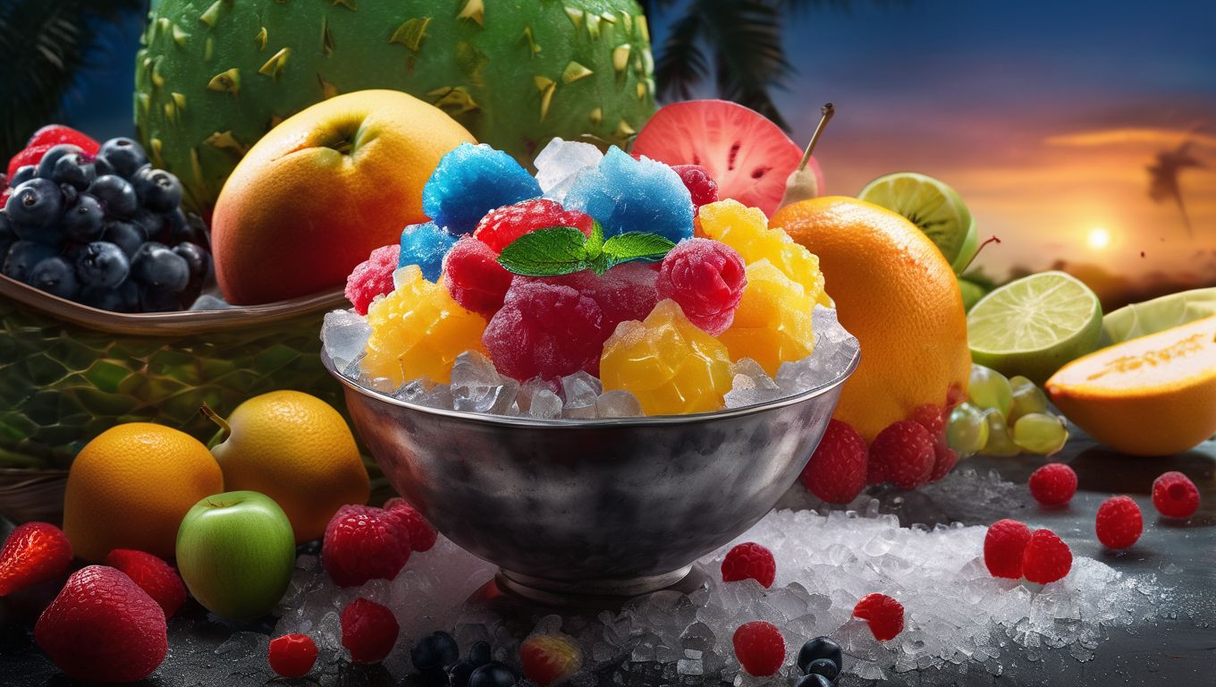 Es buah adalah minuman segar dengan potongan buah-buahan seperti jeruk, semangka, nanas, dan melon yang disajikan dalam sirup manis dan es serut.