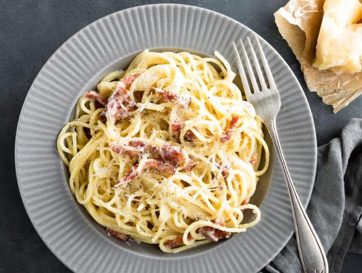 Hidangkan Spaghetti Carbonara dengan taburan keju parmesan parut dan sedikit merica ekstra di atasnya.